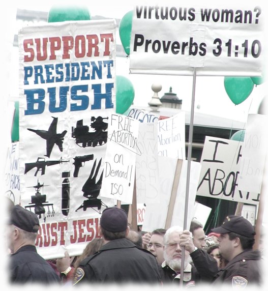 It's pathetic that the anti-choicers come to San Francisco anyway. This year it did not even make the front page of the Chronicle (terrible coverage, as usual). For the special SF audience, the antis water message down their message, pretend to abandon their terrorist tactics- heck, they even have to leave their nasty fetus pictures at home! Catholic churches from far and wide were the main organizers (and I'd suspect funders) of the busloads of people. Ostensibly, though, this march was organized by two San Francisco women (Dolores Meehan and Eva Muntean) whose resumes boast anti-gay rights activities and Catholicism to the max.
